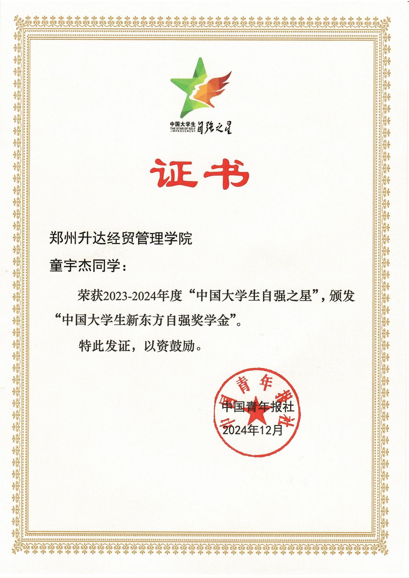 “中国大学生自强之星”奖学金推报活动每年一届。2024年3月,校团委牵头组织各学院团委广泛宣传、深入挖掘典型,开展了我校2023-2024年度“大学生自强之星”评选活动。经学校推荐、省级初评、全国评审等环节,最终我校童宇杰同学荣获“中国大学生自强之星”殊荣。