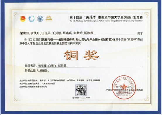 在本届赛事中,我校由侯亚茹、白鹏飞、郗艳花等老师指导,梁世伟、罗凯月、任佳美、王夏颖、蔡鑫琪、张紫焓、杨璨璨等参加的《泥塑传情—创新非遗传承,助力泥咕咕产业振兴的践行者》项目一路过关斩将,继获得“挑战杯”河南省赛金奖之后,又代表我校第一次冲破省赛天花板,首获“挑战杯”全国终审决赛“铜奖”,取得我校参加该赛事以来历史最好成绩。