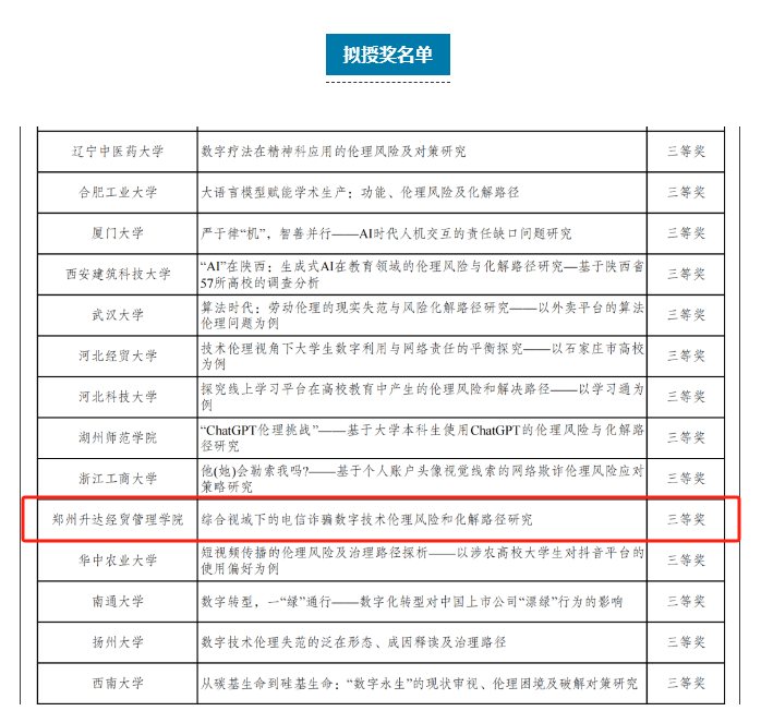 继我校商学院项目摘取第十四届“挑战杯”中国大学生创业计划竞赛(俗称“小挑”)“铜奖”,实现我校在该赛事国赛“0”的突破后,我校会计学院再传佳音,在第十九届“挑战杯”全国大学生课外学术科技作品竞赛(俗称“大挑”)“揭榜挂帅”专项赛中,该院项目《综合视域下的电信诈骗数字技术伦理风险和化解路径研究》勇夺国赛三等奖,实现我校在“大挑”专项赛道“0”的突破,我校“挑战杯”系列赛事再增1项国赛奖项。