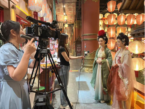 大学生华服文化节活动现场气氛热烈,以青春视角诠释中华服饰文化的当代生命力。子衿汉服社同学们通过沉浸式体验,身临其境地感受到中华传统文化的温度。活动现场,我校子衿汉服社两位学生接受电视台采访时表示:“我校子衿汉服社组织大家利用业余时间学习了缠花、簪花等传统技艺,希望中国汉服文化可以走向世界。”
