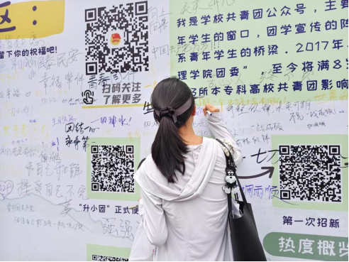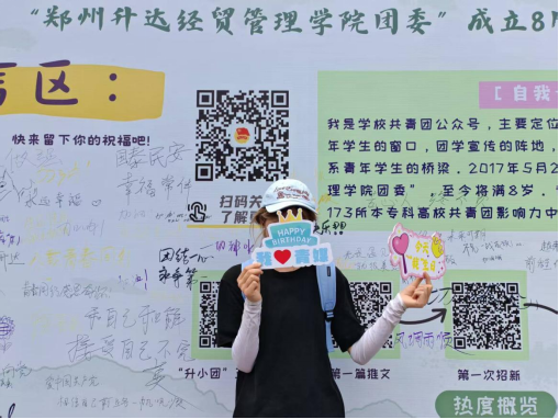 活动现场特别设置了公众号成长展示墙,通过图文并茂的形式回顾了"郑州升达经贸管理学院团委"微信公众号八年来的发展历程。展示墙前,师生们驻足观看,纷纷在留言区写下真挚祝福。