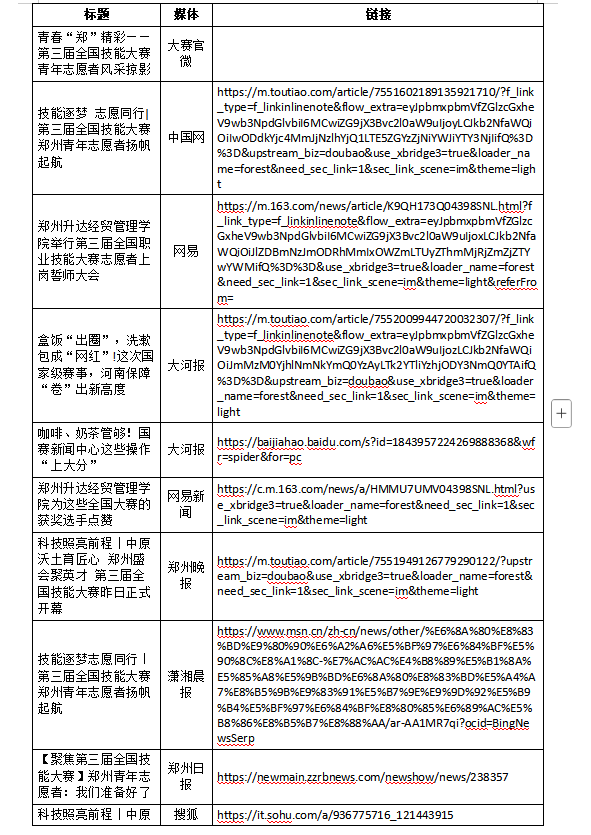 大赛期间,我校志愿者被分配至展示交流、信息技术、新闻宣传、市场推广、综合协调及后勤保障等多个部门。面对阴雨天气和连续作战的考验,我校师生志愿者们始终坚守岗位,早出晚归,秉持“零差错、高效率、暖服务”的工作标准,在各环节中无缝协作、密切配合,不仅高质量完成了执委会交办的各项任务,也以高度的责任感和青春的担当,展示了升达风采,赢得了广泛赞誉,中国网、大河报、郑州日报、网易新闻、搜狐新闻、河南共青团、郑州共青团等权威媒体或政务平台对我校师生志愿者给予了关注和报道,同时引发大量媒体转发报道。
