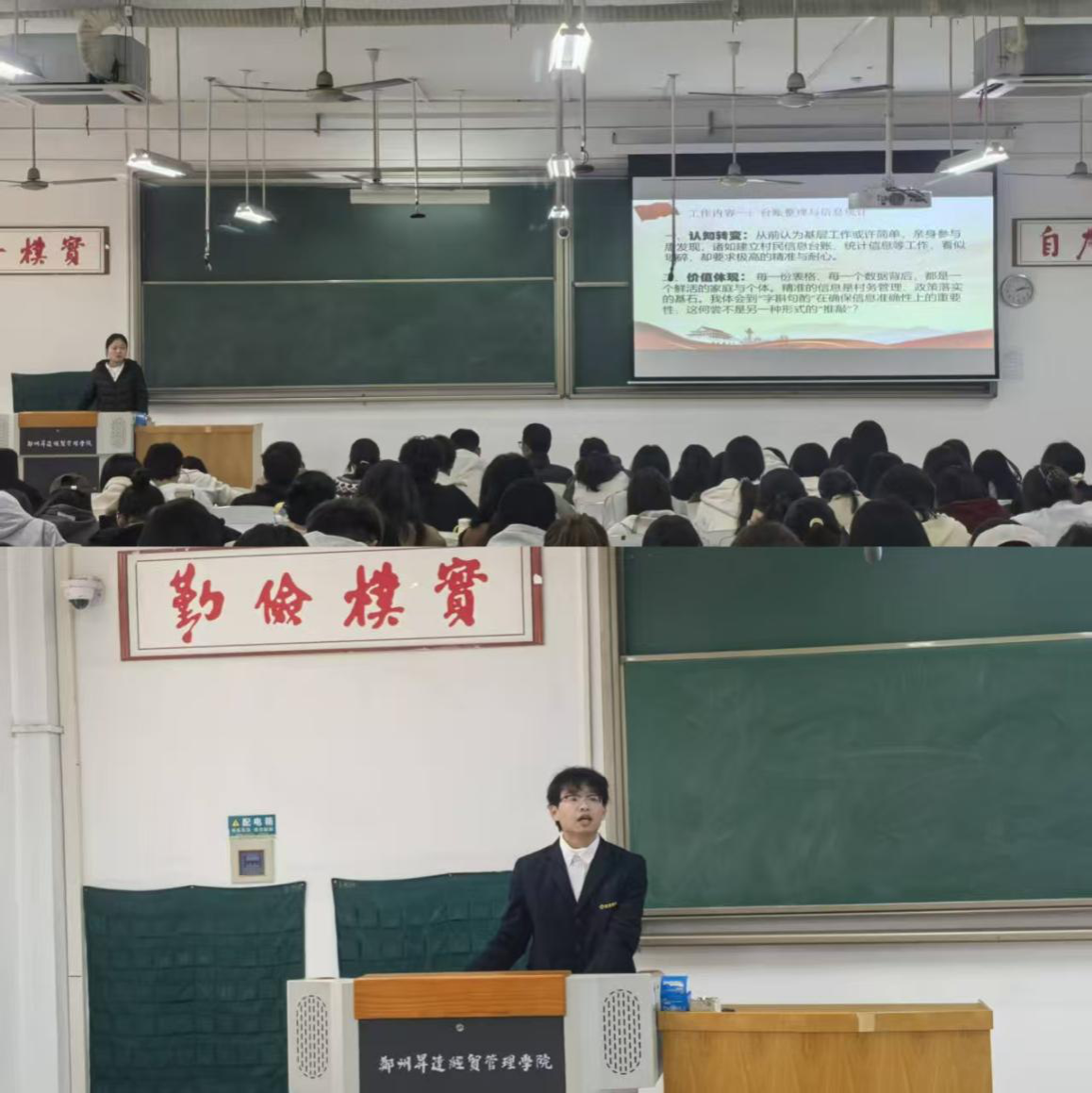 河南省“向基层报到”实践个人代表、文法学院郭倩同学(服务时长379小时)分享了她暑期社会实践服务基层的经历与心路历程,每一份表格,每一个数据背后,都是一个鲜活的个体。其真挚的感悟引发了在场同学的强烈共鸣。“返家乡”实践个人代表、数学与信息科学学院卢霖涛同学,以青春之笔绘乡村振兴之卷。他这段扎根乡野的经历令人动容,让在场的同学们对乡村振兴有了真切地感知,体现了青春担当的力量。
