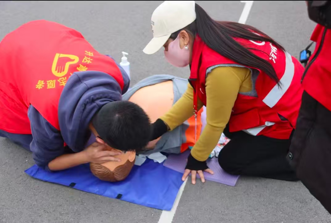 在献血活动的同时,活动场地上同时开展着“应急急救”知识现场教学培训,医护志愿者耐心的讲解,同学们认真的在人体模型上进行实操,手把手进行教学,丰富了急救知识,拓展了知识储备。