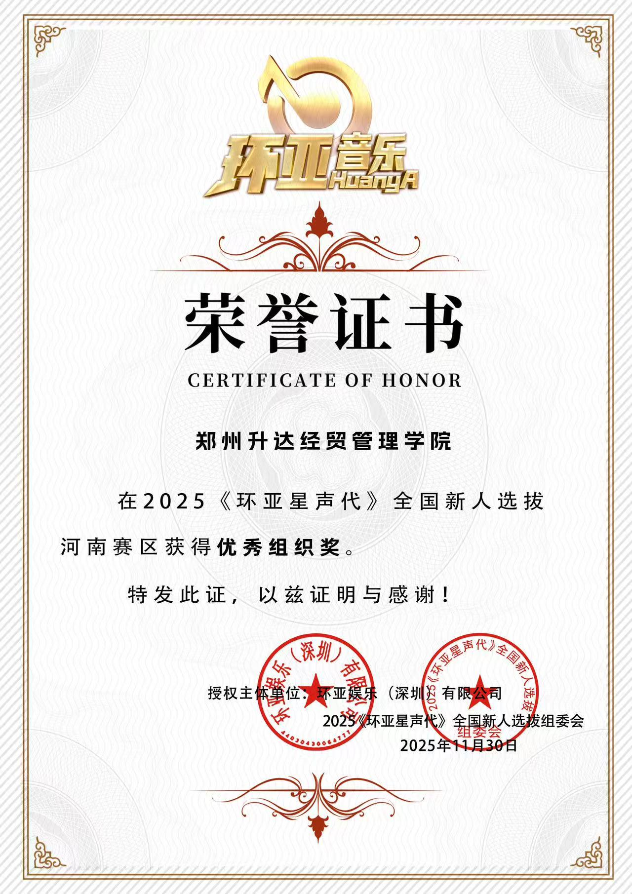 我校获2025年《环亚星声代》全国新人选拔赛河南赛区“优秀组织奖”