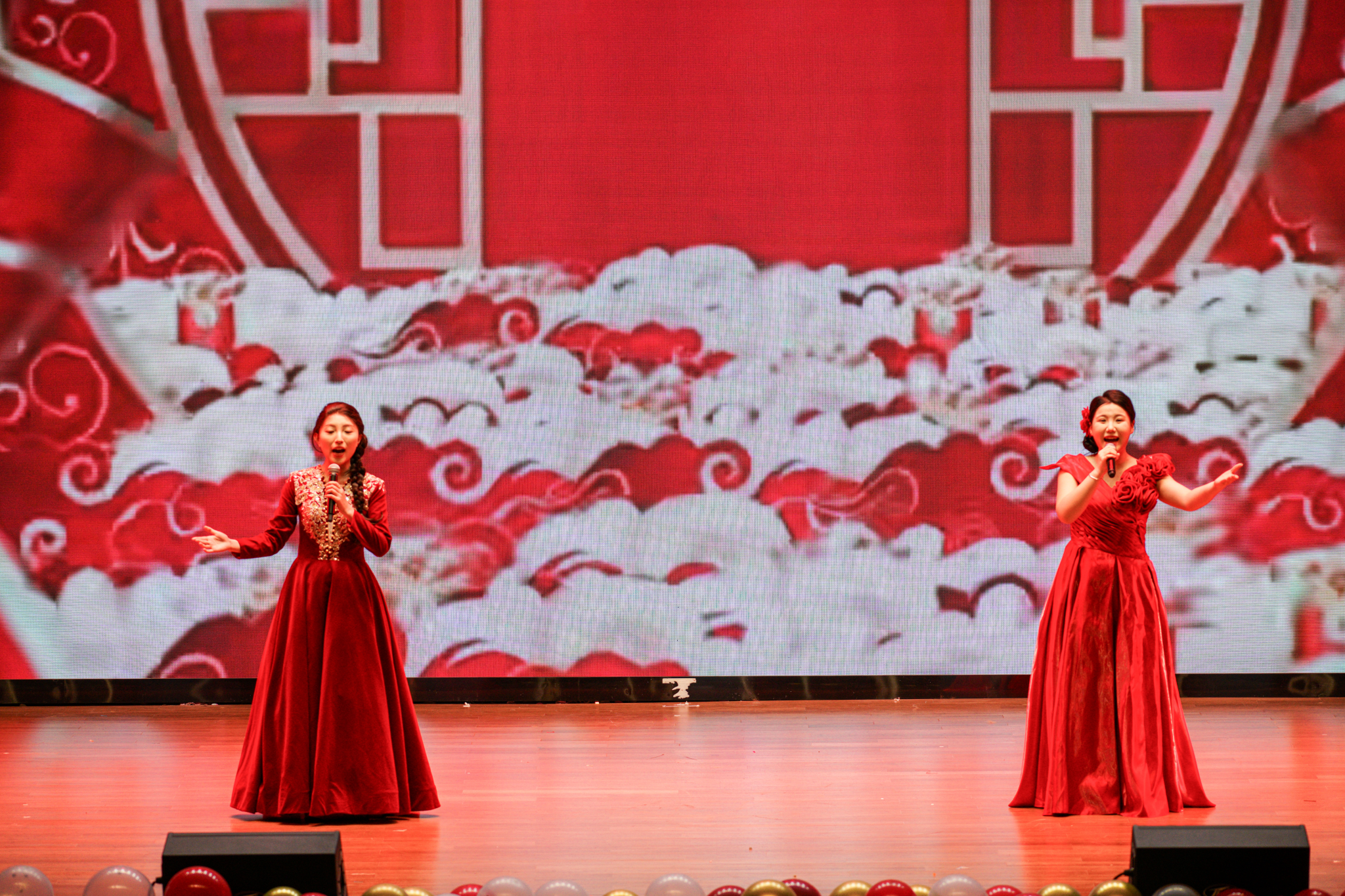 晚会接近尾声,艺术学院学生蒋雨含、李柯桐合唱《好运来》,将美好的祝福播撒至现场的每个角落。丰富的节目种类,精彩的节目内容与互动环节为舞台增添一番趣味。