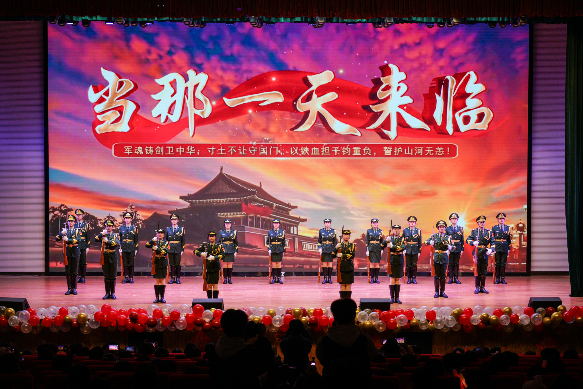 国旗班表演枪操《当那一天来临》。队员们步伐铿锵、动作整齐,展现出新时代青年的责任担当与飒爽英姿,生动诠释了忠诚、责任与担当的深刻内涵。