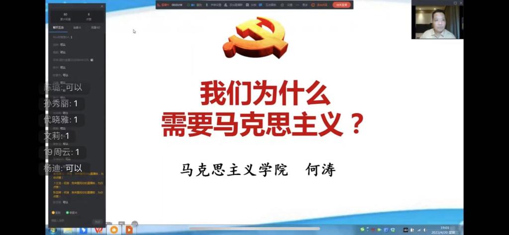 报告中,何涛教授从四个方面向我们阐明“我们为什么需要马克思主义?”这一报告主题。首先,马克思主义指导中国人民取得革命、建设和改革的胜利,是在实践中证明了的真理。其次,通过对比中外革命建设思想、道路的选择,阐明了马克思主义与中国传统文化的相似性。再次,何涛教授介绍了马克思主义作为科学的世界观和方法论的主要内容,马克思主义为中国人民认识世界、改造世界提供了强大的思想武器,当今世界局势表明,中华民族想要复兴,必须毫不动摇坚持马克思主义指导思想。最后,何涛教授运用马克思主义理论对人的本质、人生的意义和人如何活的更有价值三个方面进行深入阐述,指出以青马学员为代表的当代青年大学生要坚定共产主义远大理想和中国特色社会主义共同理想,要在中华民族伟大复兴的第二个百年征程中贡献青春力量。何涛教授整场报告高屋建瓴,语言生动,报告具有很强的理论性、思想性、指导性,青马班全体学员受益匪浅。