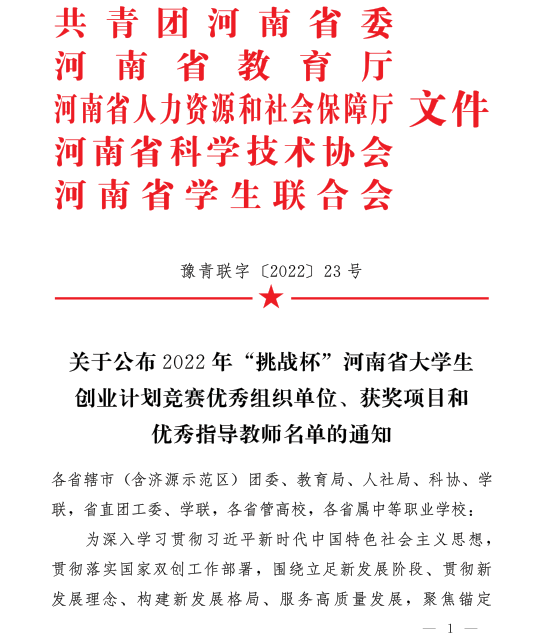 近日,由共青团河南省委、河南省教育厅、河南省人力资源和社会保障厅、河南省科学技术协会、河南省学生联合会共同举办的2022年“挑战杯”河南省大学生创业计划竞赛评选结果揭晓。我校学子的作品在省赛中荣获银奖3项,铜奖5项。
