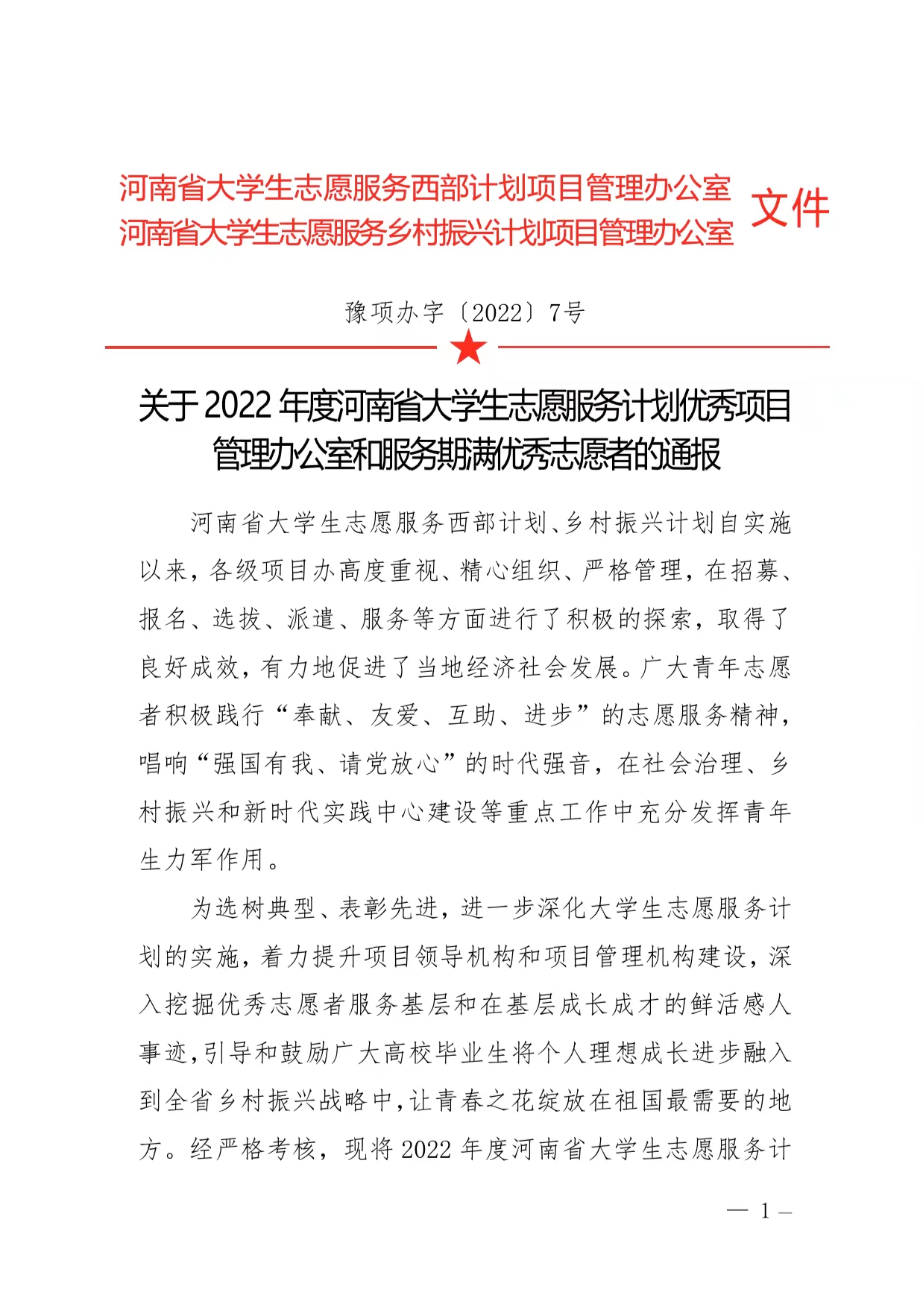近日,河南省大学生志愿服务西部计划项目管理办公室、河南省大学生志愿服务乡村振兴计划项目管理办公室联合下发了《关于2022年度河南省大学生志愿服务计划优秀项目管理办公室和服务期满优秀志愿者的通报》,我校荣获“2022年度河南省大学生志愿服务计划优秀高校项目管理办公室”荣誉称号,是本年度唯一一所获此荣誉的民办高校。
