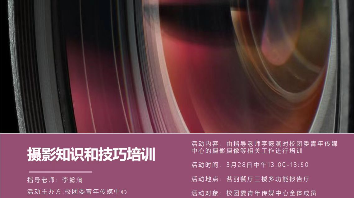 活动内容:由指导老师李懿澜对校团委青年传媒中心的摄影摄像等相关工作进行培训,就提高部门的摄影摄像能力、技术性和加强影响力展开培训