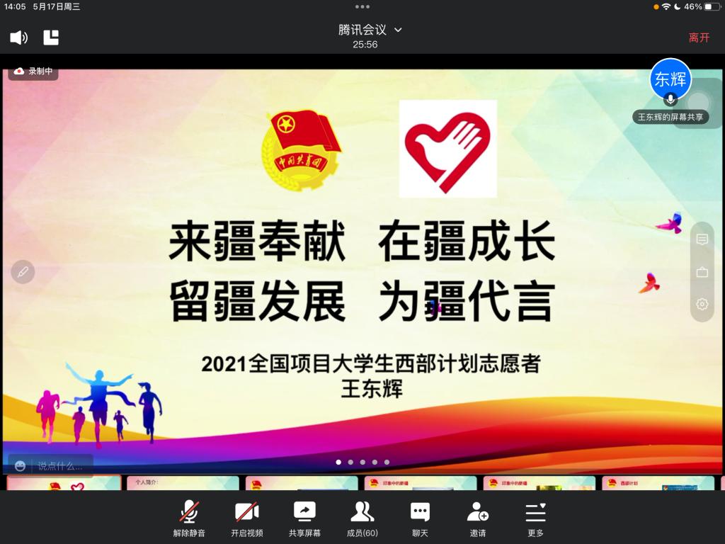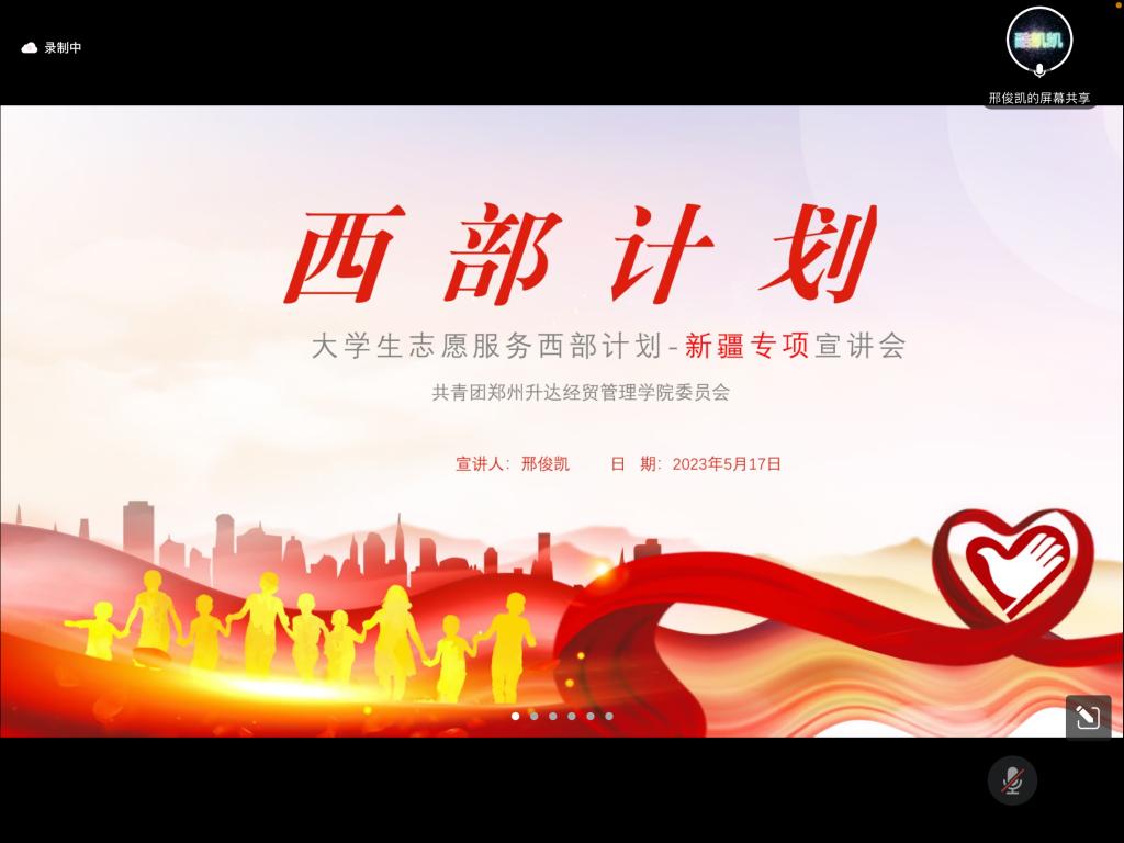 会议伊始,孔靖雯老师首先介绍了本年度西部计划各项工作的安排,对我校学生总体报名情况、咨询情况、选拔进程进行简要介绍。接着由西部计划新疆“小白杨”地方专项志愿者2020届会计学院毕业生邢俊凯、西部计划新疆全国项目志愿者2021届文法学院毕业生王东辉、河南省大学生志愿服务乡村振兴计划志愿者2022届会计学院毕业生秦广达,分别展开西部计划宣讲,并针对前期在西部计划咨询群中收集的问题逐一进行在线解答。