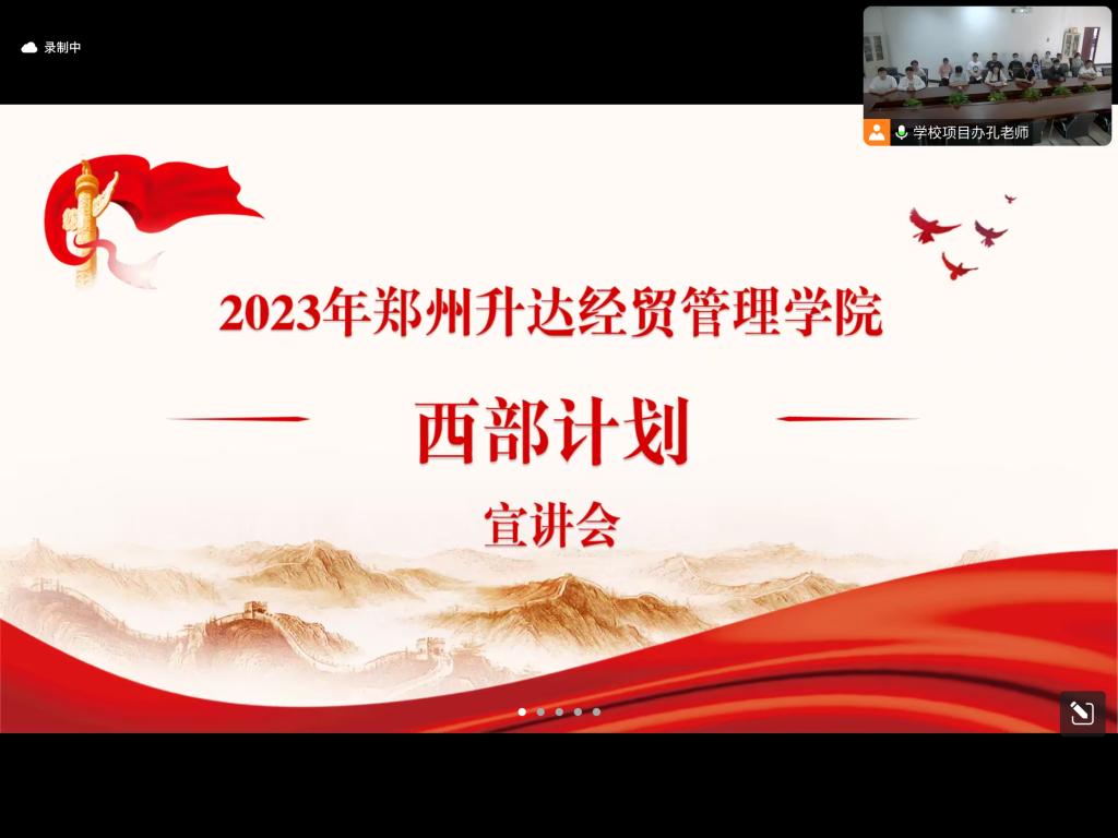 为深入学习宣传贯彻党的二十大精神,进一步做好共青团服务大学生就业工作,加深应届毕业生对大学生志愿服务西部计划项目的了解,动员广大优秀青年学子到西部、基层建功立业,2023年5月17号下午,我校西部计划项目办邀请我校往届优秀西部计划志愿者通过线上线下方式举办了西部计划宣讲会,本次会议由我校西部计划项目办公室主任孔靖雯老师主持。