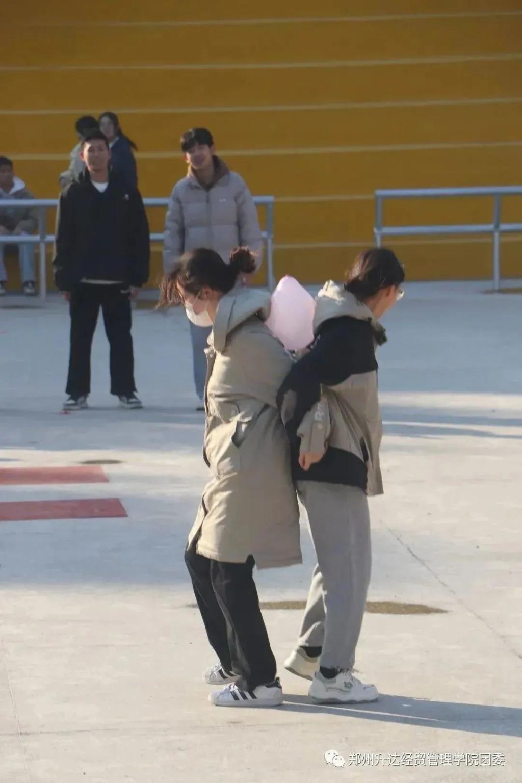 活动第二项是“螃蟹传球”成员们列队整齐,各队分别领取一个气球。由队员两两相互配合用身体夹球,在燃动人心的音乐声中,全体成员顺利完成比赛。