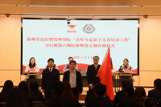 凝心铸魂育青马,青春领航新征程。10月17日下午,我校青马工程“力行班”第六期结业暨第七期开班仪式在新图书馆第一报告厅举行。校党委副书记、副校长、校工会主席张金安出席仪式并作讲话,校团委书记李霄锋、副书记兼组织部部长李雷、宣传部部长马悦、社团管理部部长张思昱、实践部部长崔译文及青马工程“力行班”第六期、第七期学员等100余人参加仪式。2023-2024学年省学联驻会主席周夏斌受邀参加仪式。仪式由校团委副书记李雷主持。
