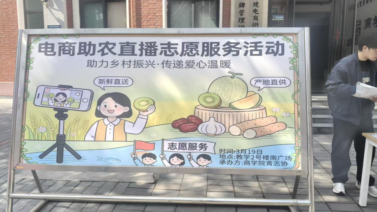 为深入弘扬雷锋精神,引导青年学子将专业知识与社会实践深度结合,以青春力量服务社会、助力乡村振兴,商学院于2026年3月20日在教学2号楼南广场举办了电商助农直播志愿服务活动,本次活动由商学院青年志愿者协会承办。