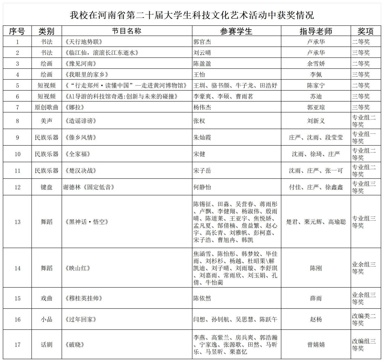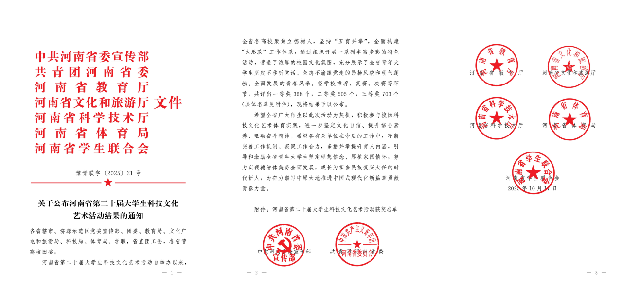 近日,河南省第二十届大学生科技文化艺术活动结果公布。我校学子的作品在众多参赛作品中脱颖而出,共斩获奖项17项。其中一等奖1项、二等奖7项、三等奖9项,涵盖书法、绘画、短视频、原创歌曲、乐器演奏、舞蹈、戏曲、小品、话剧等多个类别。