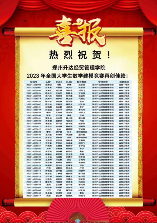 近日,2023年全国大学生数学建模竞赛河南赛区获奖名单公布。我校41支队伍获奖,其中“省级一等奖”2组,“省级二等奖”13组,“省级三等奖”26组。