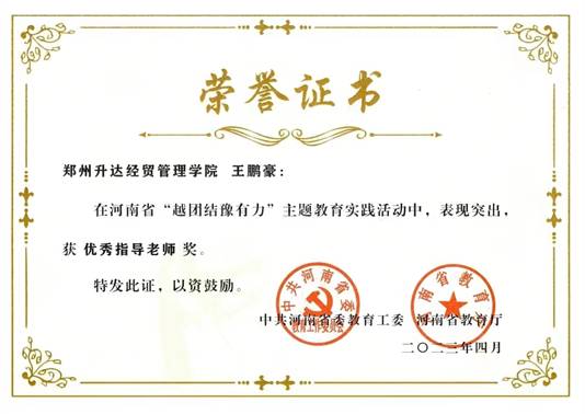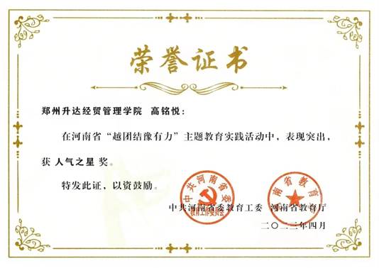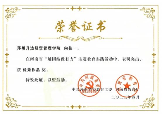 近日,中共河南省委教育工委办公室、河南省教育厅办公室公布了“越团结豫有力”主题教育实践活动获奖结果。我校荣获“优秀组织”奖,1名学生荣获“优秀作品”奖、2名教师荣获“优秀指导教师”奖、1名学生荣获“人气之星”奖。