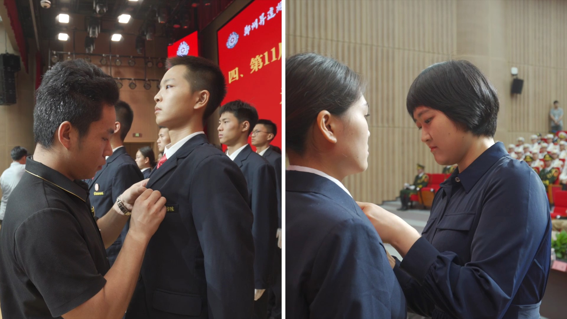 第26届国旗班班长杨智渊,第11届国旗班队员、国旗班现任指导教师王佳,作为往届指导教师和队员代表,为第29届国旗班队员代表佩戴了班徽。