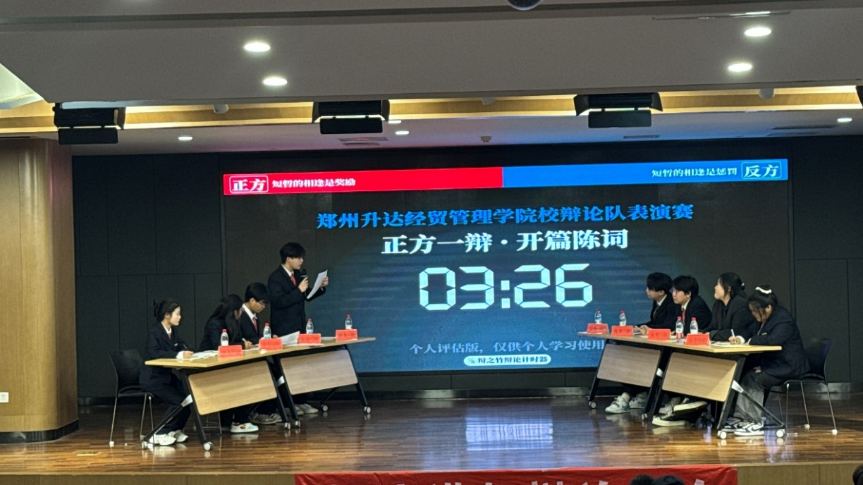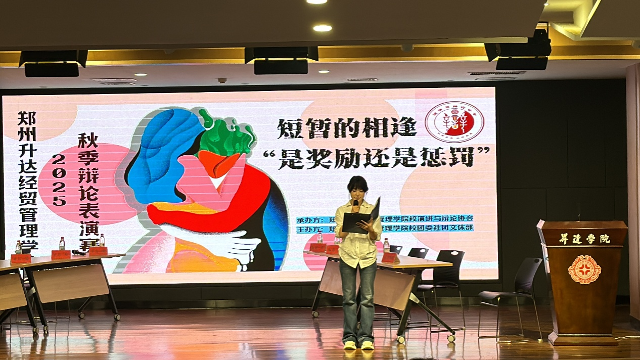 2025年10月13日,由郑州升达经贸管理学院校团委社团管理部主办、校演讲与辩论协会承办的主题为“短暂的相逢是奖励还是惩罚”的辩论表演赛在双创大讲堂成功举行。来自正反双方的辩手们以敏锐的思维、犀利的言辞展开激烈交锋,为现场观众呈现了一场兼具思想深度与语言魅力的思辨盛宴。