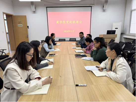 11月14日下午,商学院在教学楼2号楼315会议室召开党政联席会议,出席会议的有院长白朋飞、院党委书记郭峰、教学秘书马巧丽、行政秘书郗艳花、党委委员张姣玉及各教研室主任。