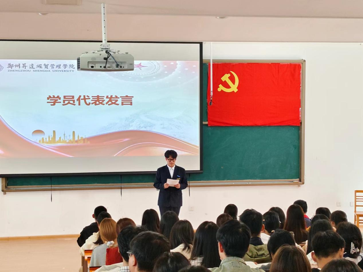 接下来,商学院党委书记郭峰同志讲话。他首先向新党员同志表示祝贺,并希望他们能做到:加强理论学习,做一个真正的马克思主义者;践行服务宗旨,为身边师生做实事;争做先锋表率,起到模范引领作用,尤其是在学校迎来本科教育教学审核评估的关键时刻,能够做一面闪光的先锋旗帜。在提到本期党课学员时,郭书记也对党课学员们提出三点要求与期望:一是要认真学习,深入思考,用习近平新时代中国特色社会主义思想武装头脑、指导实践;二是要积极参与互动交流,拓宽我们的思路和视野,不断提高我们的学习工作能力和水平;三是遵守党的纪律,提高党性修养,培养和树立良好的政治品格。