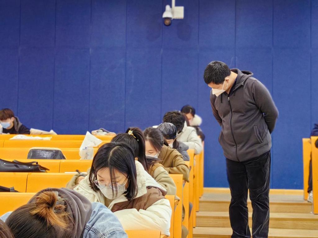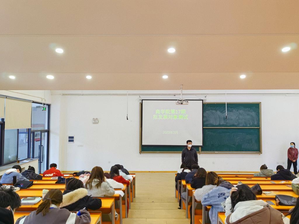 为加强党员发展对象培训工作,提高发展党员质量,2023年3月17日中午,商学院党委在教学楼二号楼116教室举行第十七期拟发展对象水平测试。商学院党委书记郭峰同志巡考,学生党支部书记张莹同志、张荣凯同志、杨慧同志、刘琳琳同志负责监考事宜。