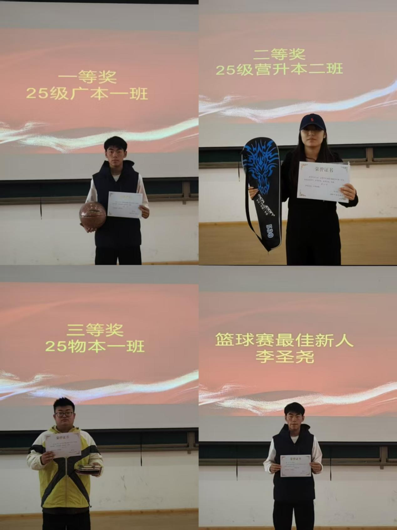 比赛过程高潮迭起,战况激烈。在首轮淘汰赛中,25级物本1班与25级广本2班展开激烈对决,双方攻防节奏紧凑,多次陷入胶着,最终25级物本1班凭借关键回合的稳定发挥,以40:32艰难锁定胜局。决赛更是精彩纷呈,25级广本1班与25级营升本1班全程比分紧咬,25级广本1班在最后时刻打出精妙配合,以62:59险胜夺冠;25级营升本1班虽以3分之差位居亚军,但同样展现出顽强斗志。整届赛事在激烈而圆满的氛围中落下帷幕。