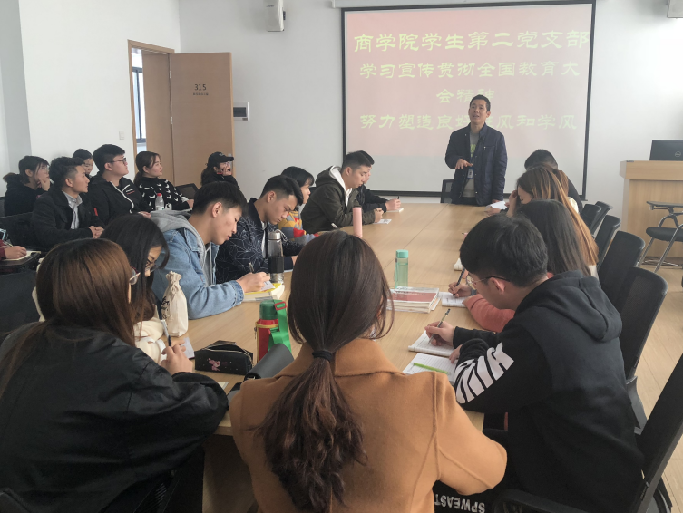 12月4日,商学院学生第二党支部在2号楼315会议室开展了“学习贯彻全国教育大会精神”活动,此次活动旨在学习全国教育大会精神,努力塑造良好的班风和学风。商学院学生第二党支部全体党员、预备党员、积极分子参与了活动。活动由商学院学生第二党支部书记王楠老师主持。