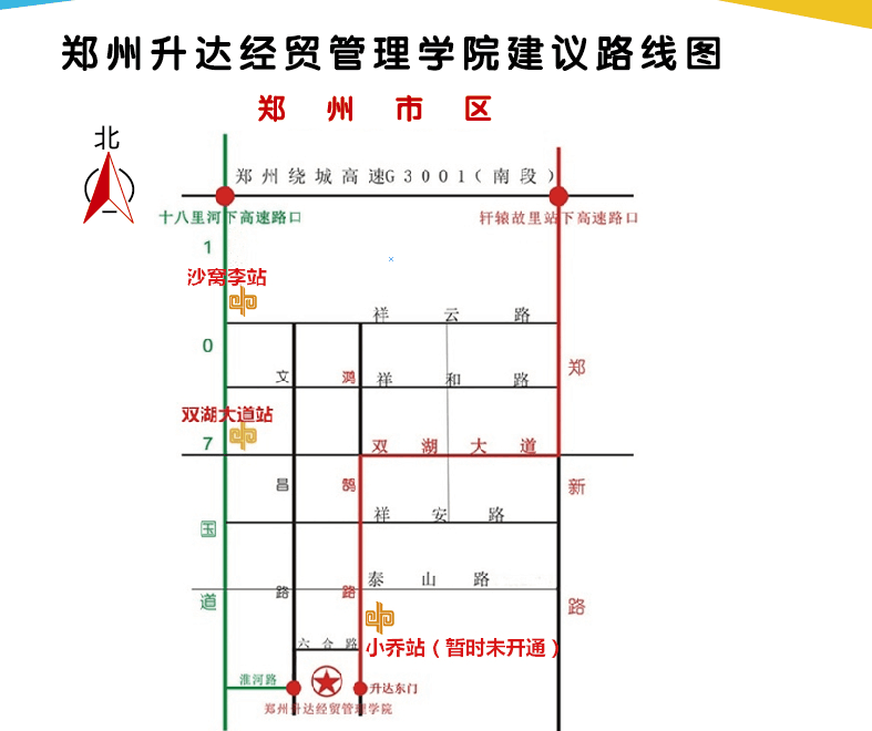 建议一(红色路线):轩辕故里站下高速走新郑路,转双湖大道(祥云路、祥安路或祥和路) 走鸿鹄路直达学院东门。