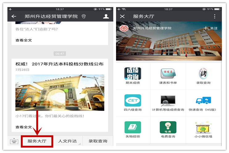 3、关注学院官方微信:shengda_university,点击底部菜单“服务大厅”