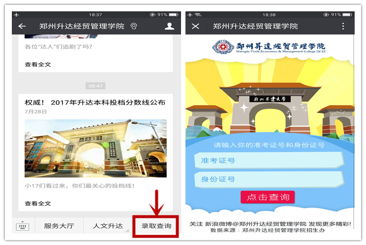 2、关注学院官方微信:shengda_university,点击底部菜单“录取查询”。