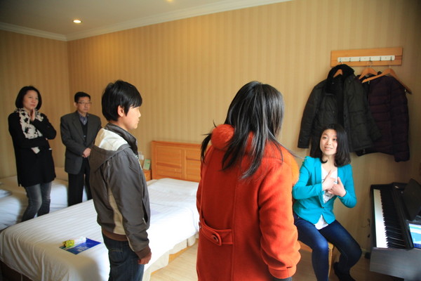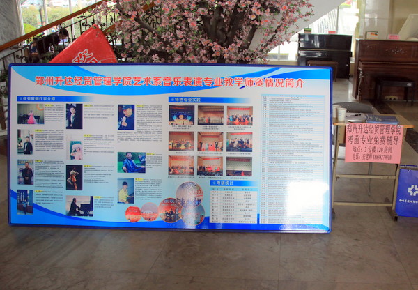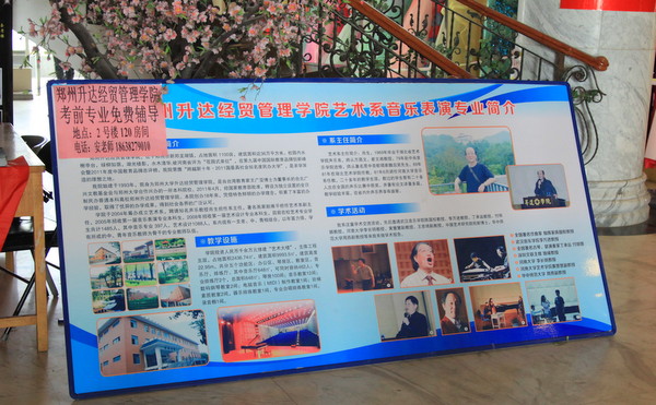 登封鹿鸣山庄是音乐专业考生集中考点,从3月4日到3月24日,艺术系在此现场招生宣传,在宣传我院艺术系的同时,艺术系教师还免费为艺术考生们进行考前辅导。这一招生形式的创新开展,收到了很好的宣传效果。初到鹿鸣山庄,就看到我院醒目的宣传条幅。在侯考大厅里,摆放有我院宣传展板,艺术系师生还不时为等待考试的考生和家长送上免费矿泉水和宣传资料,温馨的服务赢得阵阵赞美。