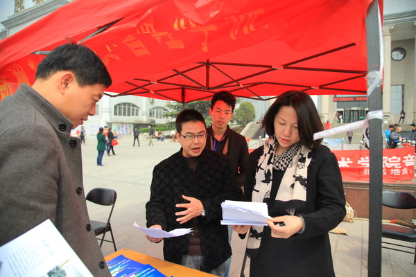 在招生宣传现场,艺术系安然、张爽、刘新义、王勇老师为考生现场指导,老师们各个细心指导,不时有考生慕名前来备考和咨询。艺术系的四位优秀同学,手拿精心制作的2013年音乐系招生简章和宣传手册,耐心向前来了解情况的家长介绍学院和艺术系的专业设置、学习环境、师资力量等。