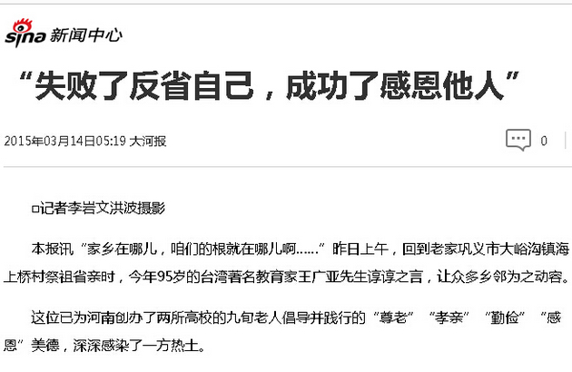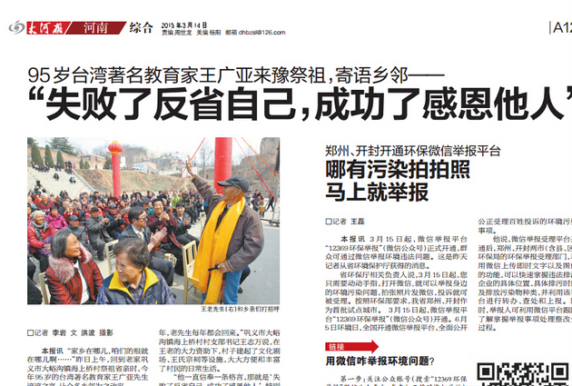 大河报:《95岁台湾著名教育家王广亚来豫祭祖,寄语乡邻——“失败了反省自己,成功了感恩他人”》