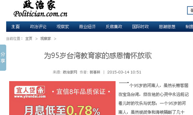 政治家:《为95岁台湾教育家的感恩情怀放歌》