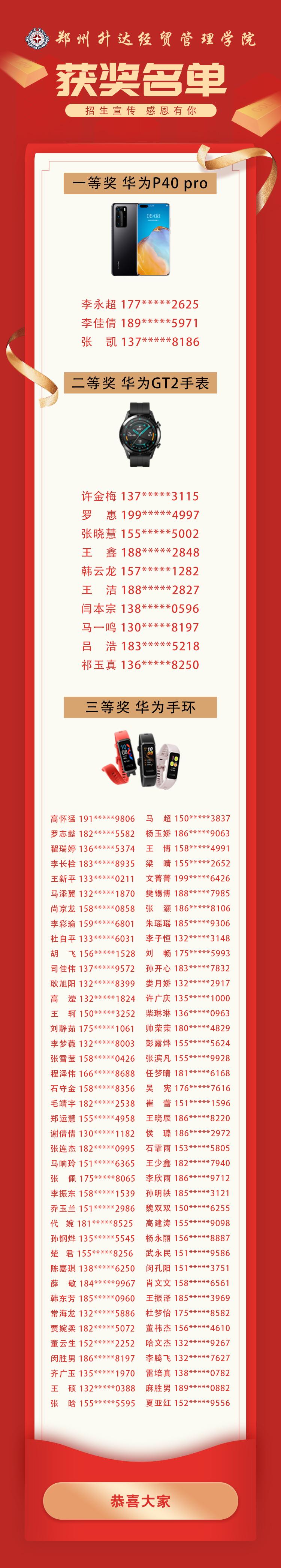 之后,学校领导抽出了一二三等奖。分别为华为P40pro三部、华为GT2手表10个和华为手环80个。