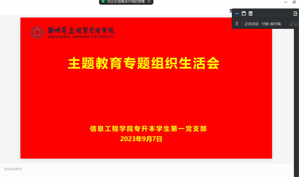 9月7日下午,信息工程学院专升本学生第一党支部线上召开主题教育专题组织生活会。会议由党支部书记冯煜婷主持,支部全体党员参加。