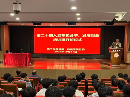 2024年10月18日晚,信息工程学院与数学与信息科学学院联合举办了第20期入党积极分子、发展对象培训班开班仪式。数学与信息科学学院党委书记朱永恒、信息工程学院党委书记李赵法,信工学院、数信学院、总务、学务和机关全体学员参加开班仪式,仪式由信工学院组织员王迪主持。