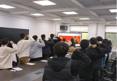 最后,党支部书记李金希对本次成为预备党员的同志表示祝贺,同时告诫全体党员要加强思想理论的学习,不仅要从组织上入党,更要从思想上真正入党,并对他们提出希望和要求,要用实际行动践行“一个党员一面旗帜”的示范作用,为党奉献争取如期转正成为一名正式党员。之后,由副书记柳晨曦带领全体党员进行入党宣誓。