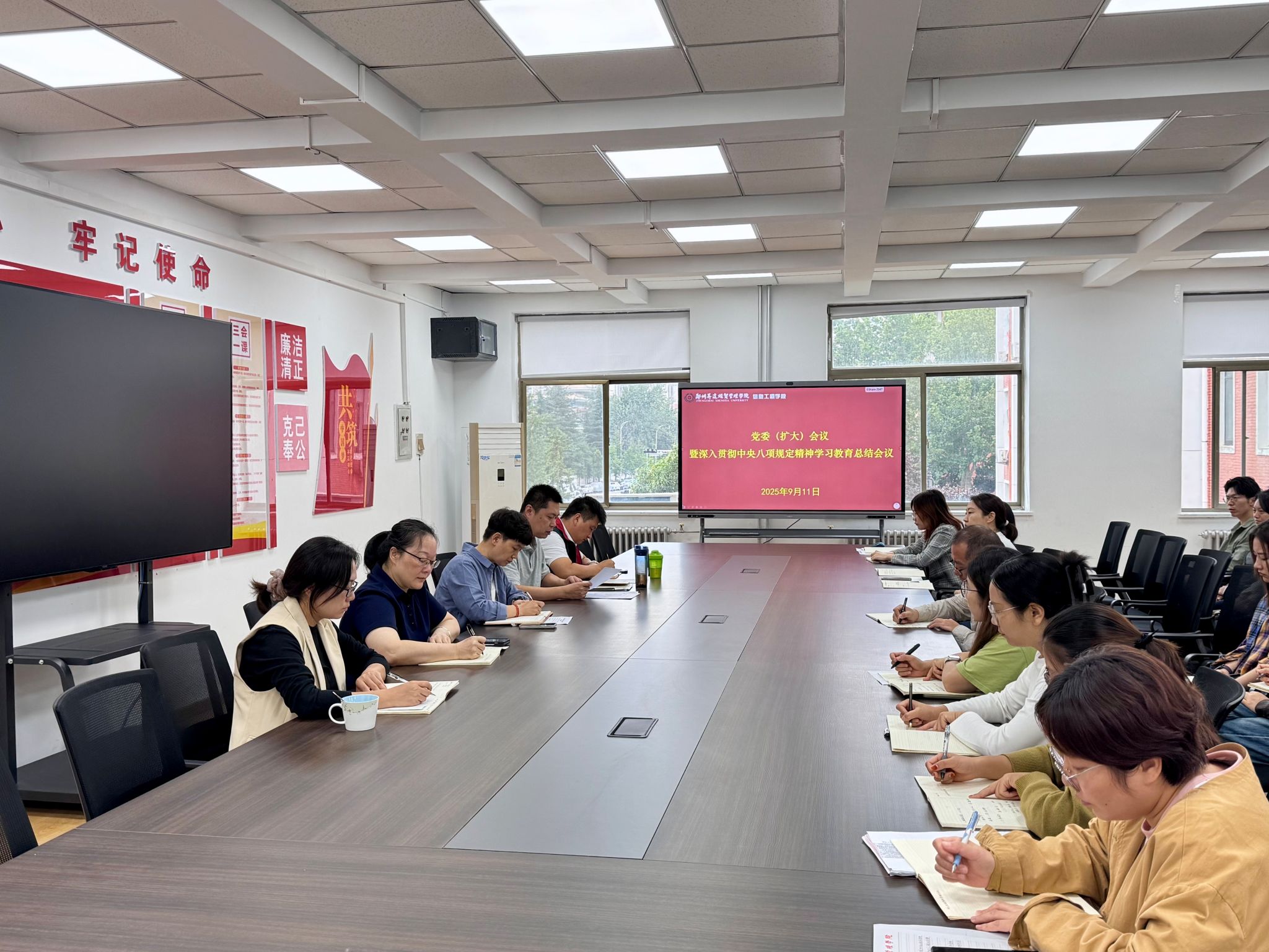 9月18日上午9时,信息工程学院党委在商管楼218会议室召开党委(扩大)会议暨深入贯彻中央八项规定精神学习教育总结会议。学院党委书记钟江鸽主持会议,全体党委委员、各党支部书记及各党支部全体委员或副书记参会,共同总结学习教育成效、安排收尾工作,推动学院作风建设走深走实。