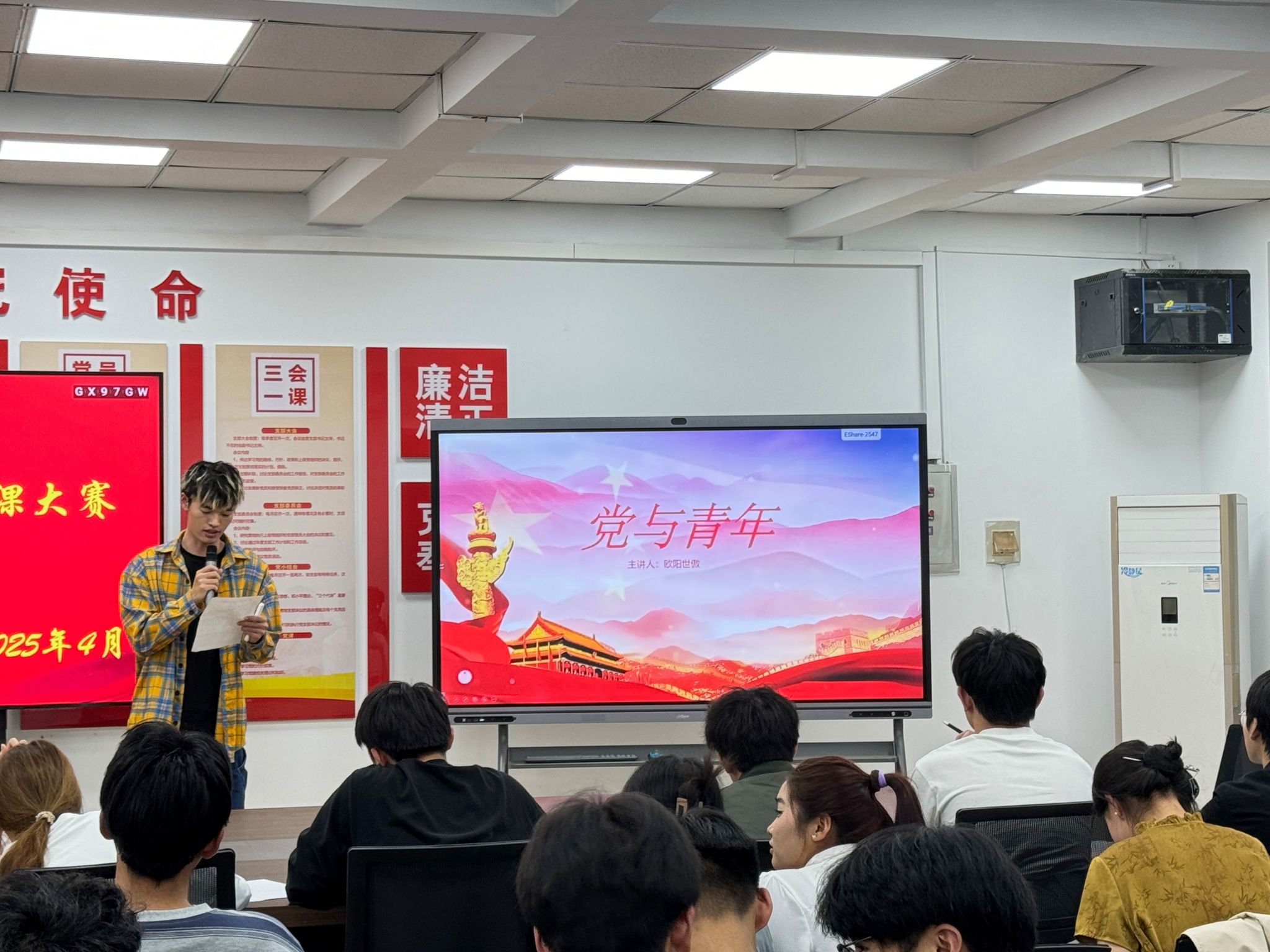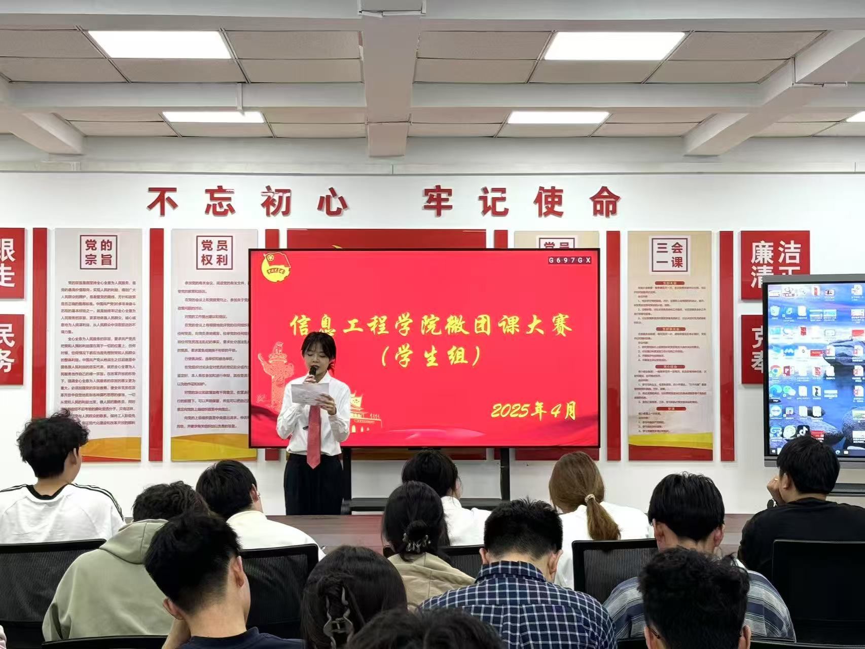 2025年4月14日晚7点,信息工程学院学生组微团课大赛在商管楼218教室火热开启。本次大赛旨在深入学习贯彻党的二十大精神,加强青年思想政治引领,激发团员青年的学习热情与创新活力,吸引了众多学生到场观摩。
