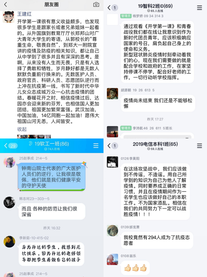 收看结束后,学院师生群情激昂,深受鼓舞,通过各班的QQ群或微信群表达了自己的听课感受。
