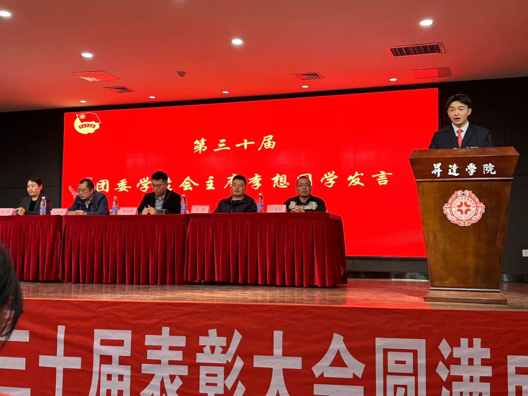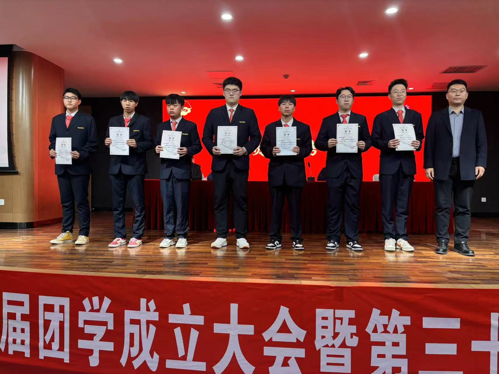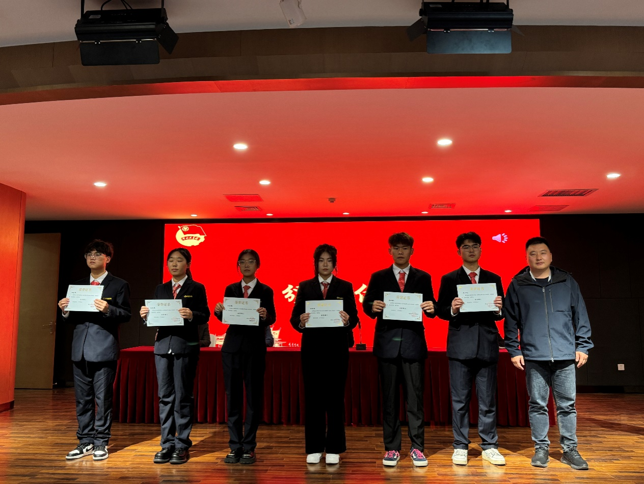 24级团总支书记赵征、22级团总支书记王建红和团委书记兼行政秘书王崇分别为学生会优秀干事、优秀部长、优秀部门颁发了奖状,党委书记李赵法为第三十届主席团成员颁发了证书和奖品,并合影留念。