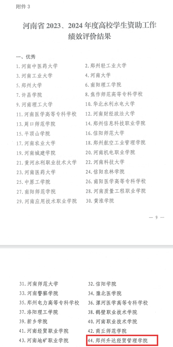 近日,河南省教育厅 国家开发银行河南省分行《关于公布全省学生资助工作绩效评价结果的通知》(教资助〔2025〕158号),我校获评全省高校2023、2024年度学生资助工作绩效评价“优秀”等级。
