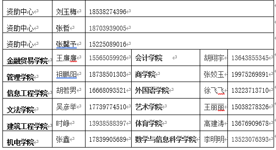 为了更好服务家庭经济困难学生和家长,资助中心热线电话0371-62436226除在暑期集中受理外,工作日常年开通。以下表中为资助中心及各学院资助专员暑假期间资助宣传咨询电话: